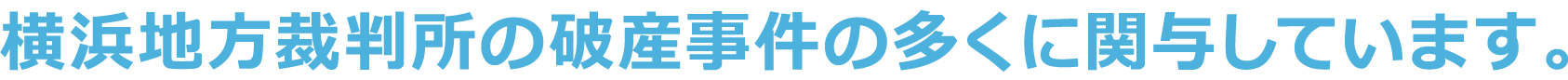 破産管財人は、倒産事件について慣れている弁護士が選任されますが、横浜横須賀法律事務所の弁護士は、皆、裁判所から破産管財人として選任され、各人とも常に複数の案件について破産手続の処理を行っています。