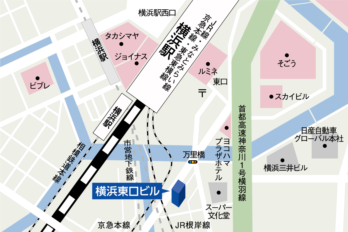 電車でお越しの方 JR各線、京急線、東急東横線、みなとみらい線、相鉄線の各線 横浜駅東口から徒歩3分 みなとみらい線 新高島駅より徒歩5分 横浜市営地下鉄ブルーライン 高島町駅より徒歩5分 お車でお越しの方 弊事務所1階にコインパーキングがあるほか、近隣にも駐車場が多数ありますのでご利用下さい。 |